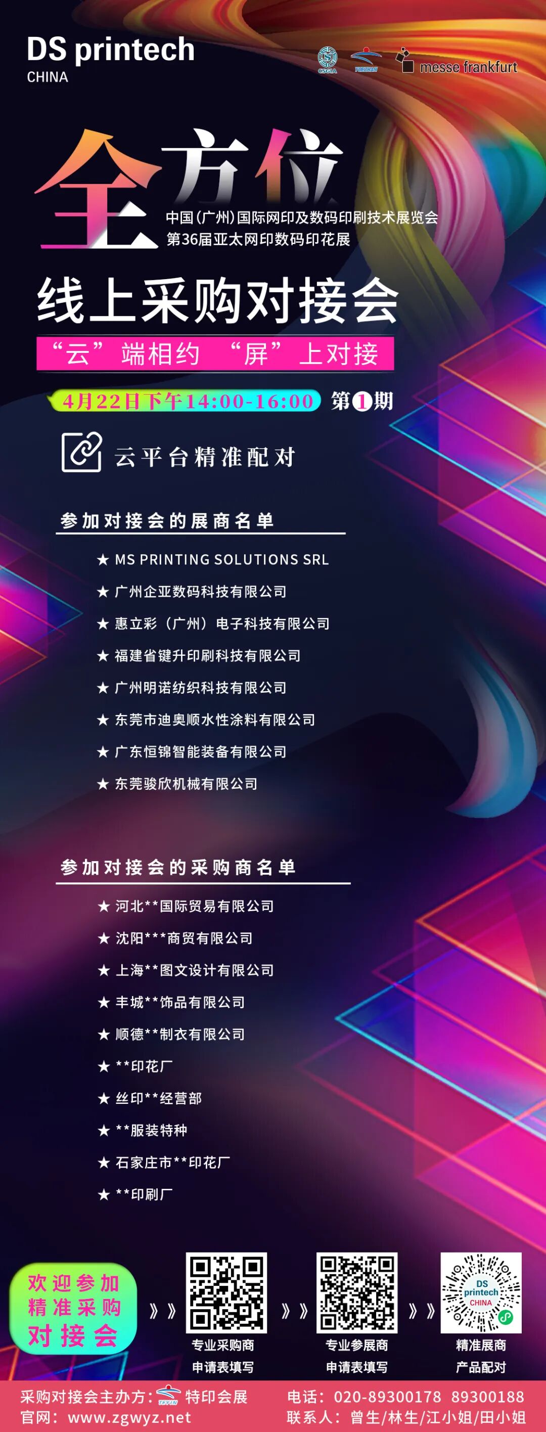 由中國印刷技術(shù)協(xié)會網(wǎng)印及制像分會(CSGIA)、廣州市特印展覽服務(wù)有限機構(gòu)(TEYIN)、法蘭克福(香港)有限機構(gòu)聯(lián)合主辦的亞太網(wǎng)印數(shù)碼印花展線上采購對接會,將于2022年4月22日下午14:00-16:00在線上舉行,現(xiàn)已進入最后倒計時,參會企業(yè)、日程安排全新發(fā)布!